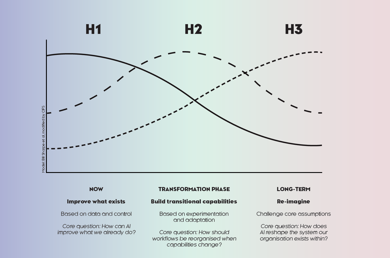 Rooted in a Horizon 3 perspective, it is designed as a think-and-do tank where we explore the interplay between AI and foresight in order to reframe our perceptions of plausible future paths of people, societies, businesses and the established interconnections.